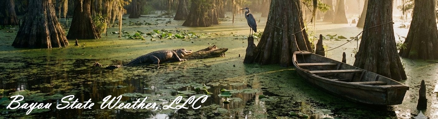 While this web site, Bayou State Weather LLC, attempts to bring you the very latest in weather information, it is subject to the availability and realiability of the internet and the functionality of the computers running the many software programs which generate weather information. The information on the pages should always be checked for accuracy and should NEVER be used for the protection of life and/or property. |