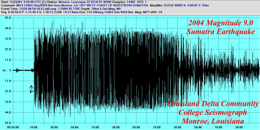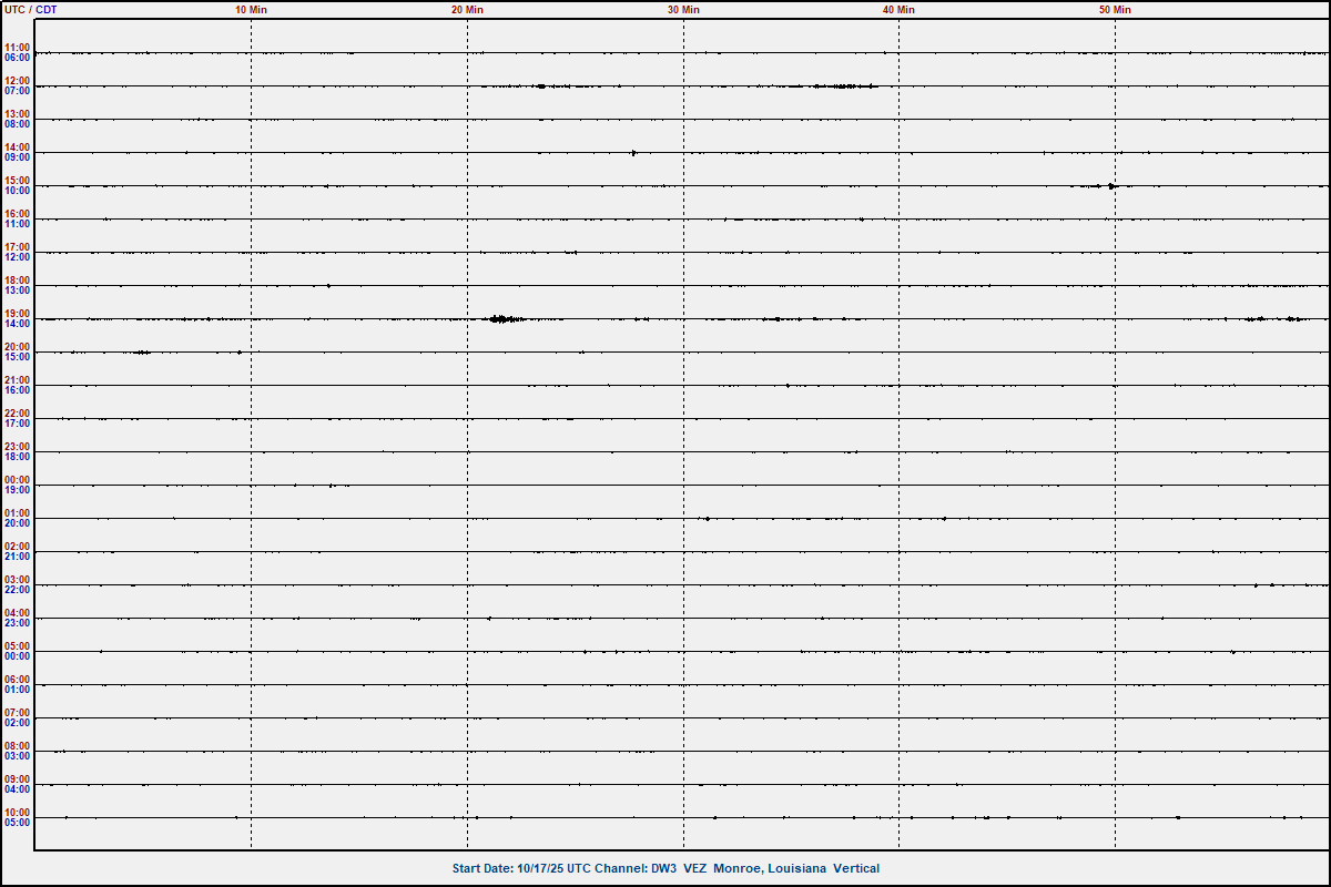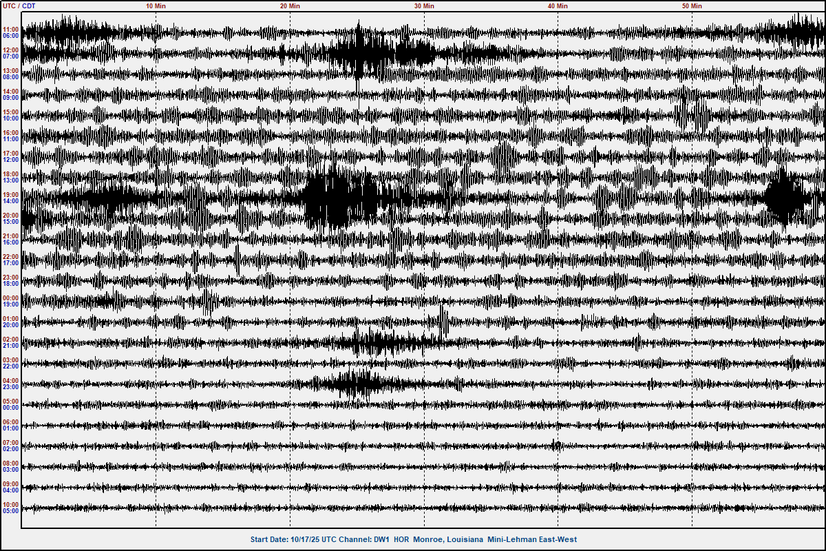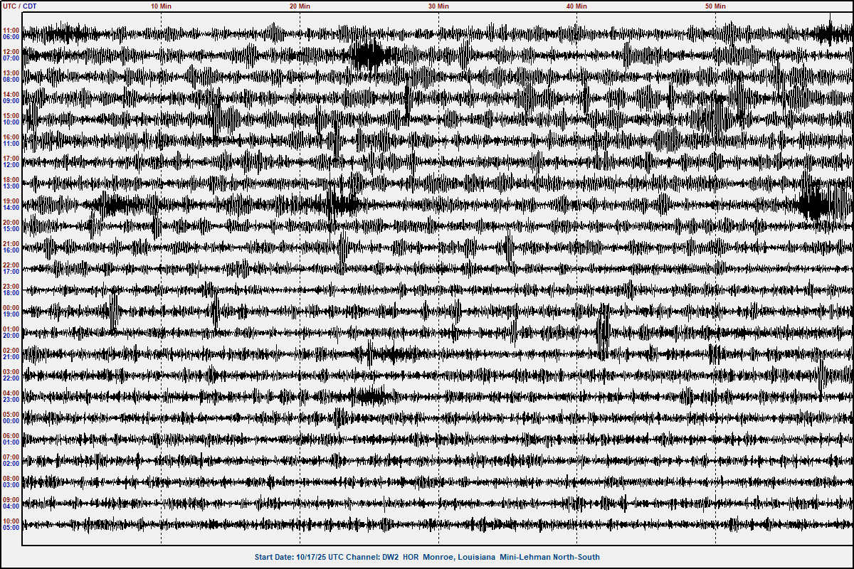 Live Helicorder from Monroe, Louisiana- 5 minute updates Important Observation Notes about Seismograms The image above depicts a live seismogram as recorded by a sensor. The seismogram above is unfiltered. Unfiltered means that normal foot traffic, road traffic, lightning discharges, strong wind, and the occasional passing train will register on the images. With training, one can be able to identify the different signatures. Processed images of events on the main page are filtered so that the abovementioned phenomena will not be shown. Small earthquakes will not likely show up on the live seismograms as they are frequently embedded in the background noise and must be filtered.