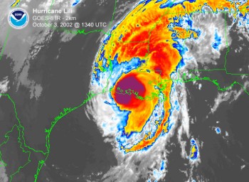 With Lili in a growingly favorable environment, all models indicated significant strenghening. She did not disappoint. In fact, Lili exceeded model predictions. The storm became a major category 3 storm with winds of 120 mph at 1500 Z on Oct. 2 and continued to "bomb" into a dangerous category 4 storm at 1800 Z on Oct. 3. Lili's winds peaked at 145 mph with a minimum central pressure of 938 mb or 27.70 inches of mercury.