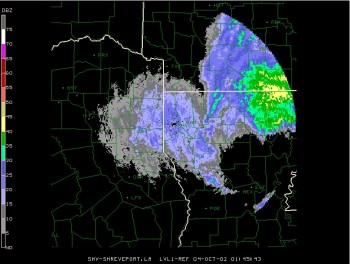 Lili continued her march northward toward Alexandria spawning tornadoes along the way. The center of Lili, now downgraded to a tropical storm, crossed Monroe around 10 PM, October 3. Winds in and around the Monroe were sustained at 25-35 mph with gusts over 50 mph producing tree damage and power outages across the region. Radar estimates along with actual reports indicated that 2-5 inches of rain fell along Lili's path over northeast Louisiana. Richwood High School's weather station recorded a 52 mph gust at 7:05 PM and a low pressure of 29.28" at 9:50 PM.