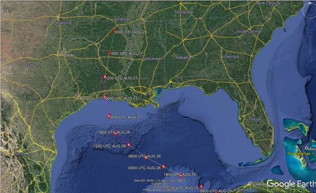 All indications were showing rapid intensification once Laura emerged off the western tip of Cuba and into the warm waters of the southeastern Gulf of Mexico. Most computer models, as well as official forecast intensities kept Laura as a category 2 or 3 storm upon landfall with 100 mph sustained winds. Once the storm emerged from Cuba and entered the gulf, rapid organization began as well as the expected intensification. With each model output, forecast intensity levels continued to increase. Throughout the day Wednesday, August 26, maximum intensity grew from 120 mph as of the 4AM forecast discussion to 150 mph with the 4PM forecast discussion.