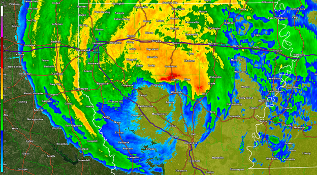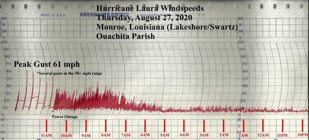 As Laura moved inland, windspeeds began to drop. Tropical storm force winds were widespread across all of north Louisiana and into south Arkansas with some gusts approaching hurricane force. Given the strong wind gusts over a long duration, some 3-5 hours, extensive tree and powerline damage occurred. Below are select peak gusts measured in Louisiana. Note that some wind recording equipment failed due to power outages before the strongest winds arrived at a particular location.