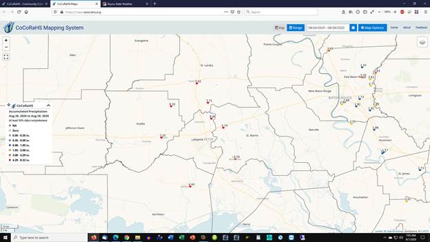 Because of the fast movement of Laura, rainfall totals were respectable for a tropical system. Along and to the right of the path, totals were generally in the 4 to 8 inch range. Little if any data is available for the extreme southwest portion of the state, however, 8.32” was the highest total in Church Point just to the northwest of Lafayette. Totals tapered off both east and west of the storm track.