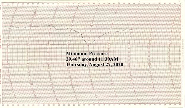 Note: Power outage prevented a continuous trace with the higher gusts. Chart was periodically advanced manually.